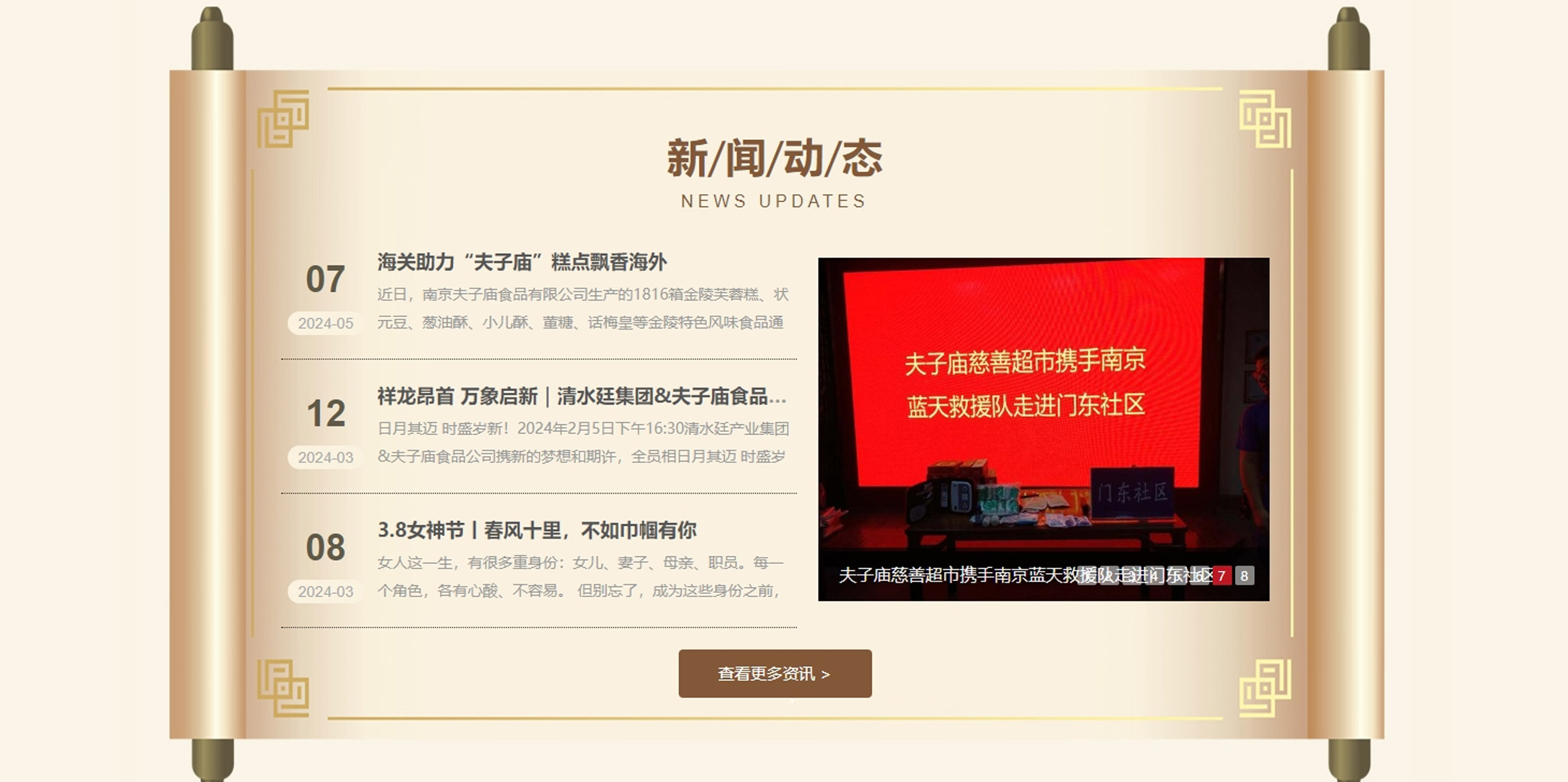 · 在【新聞中心】模塊,我們將發(fā)布關(guān)于夫子廟食品的官方新聞,更有與食品相關(guān)的要聞,便于各位用戶及時(shí)了解公司最新消息,更加了解夫子廟食品,了解來自南京的老字號(hào)糕點(diǎn)品牌。